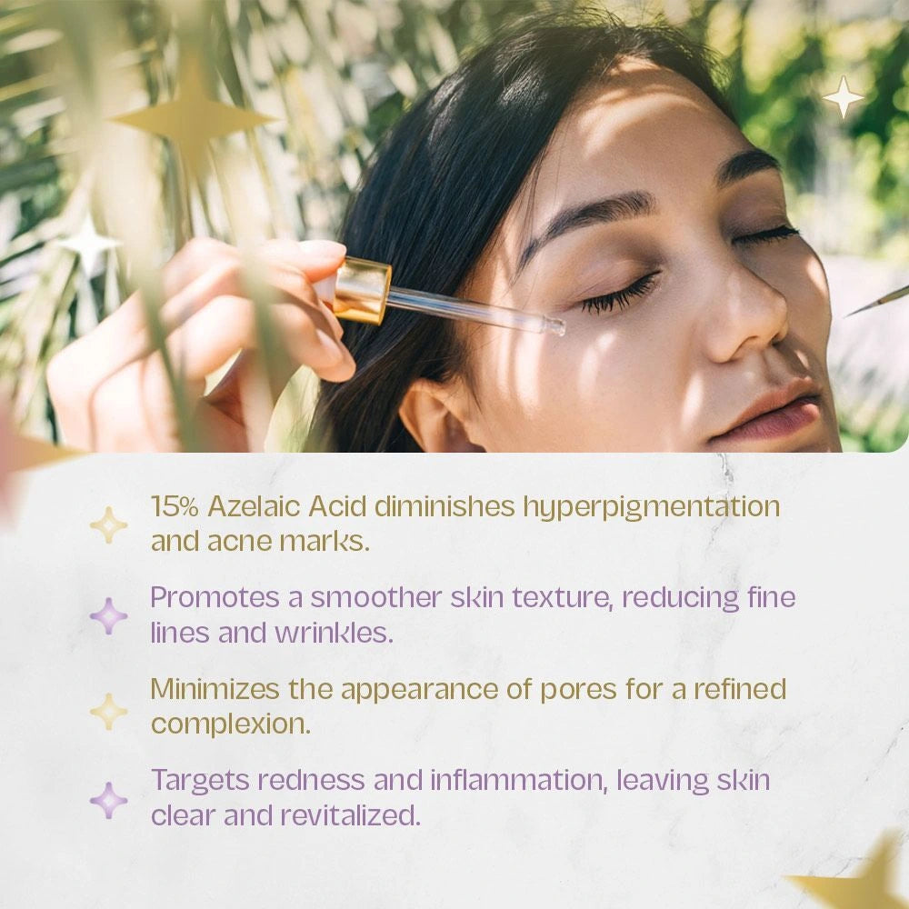 - Our serum's high concentration of Azelaic Acid works to fade dark spots and discoloration, revealing a brighter, more even skin tone.
