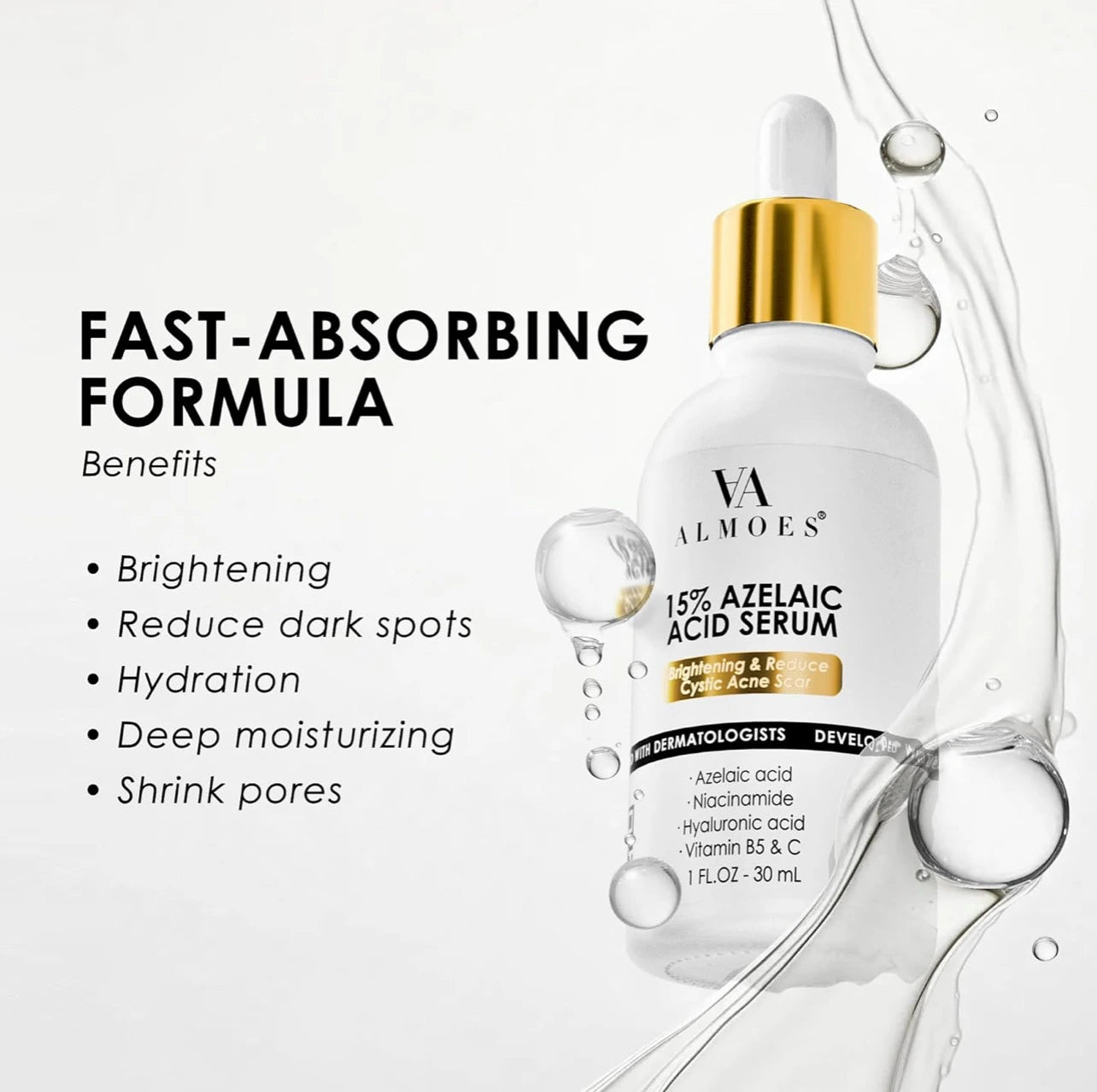 Introducing Almoes Azelaic Acid 15% Skin Serum – Your Key to Radiant, Brightened Skin!Unlock the secret to a luminous complexion with our advanced formula that combines the power of Azelaic Acid, Niacinamide (Vitamin B3), and Vitamin B5. This innovative serum is carefully crafted to provide a comprehensive solution for achieving brighter, healthier-looking skin.Key Ingredients:- Azelaic Acid 15%: