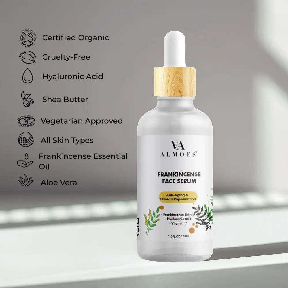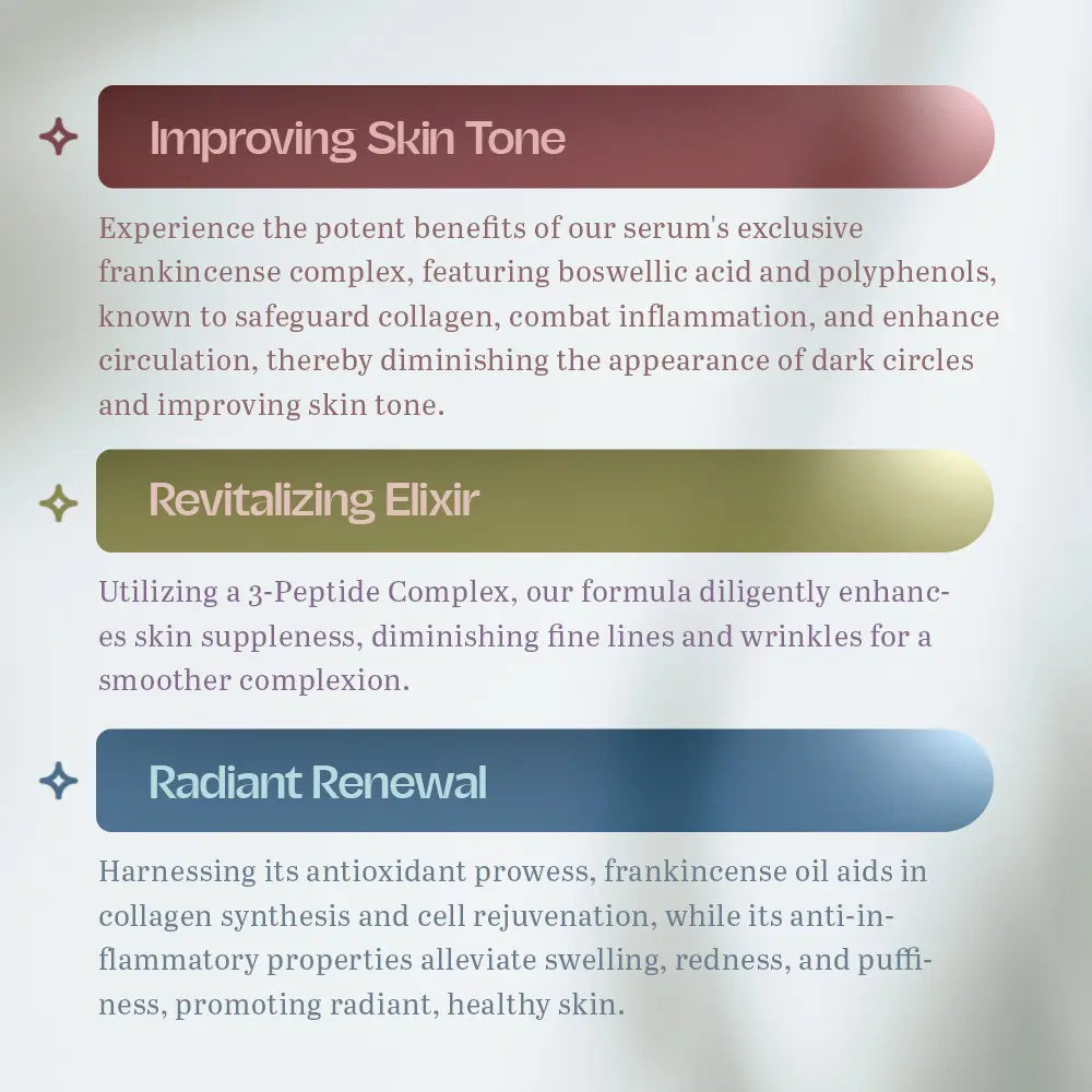 Experience the potent benefits of our serum's exclusive frankincense complex, featuring boswellic acid and polyphenols, known to safeguard collagen, combat inflammation, and enhance circulation, thereby diminishing the appearance of dark circles and improving skin tone.